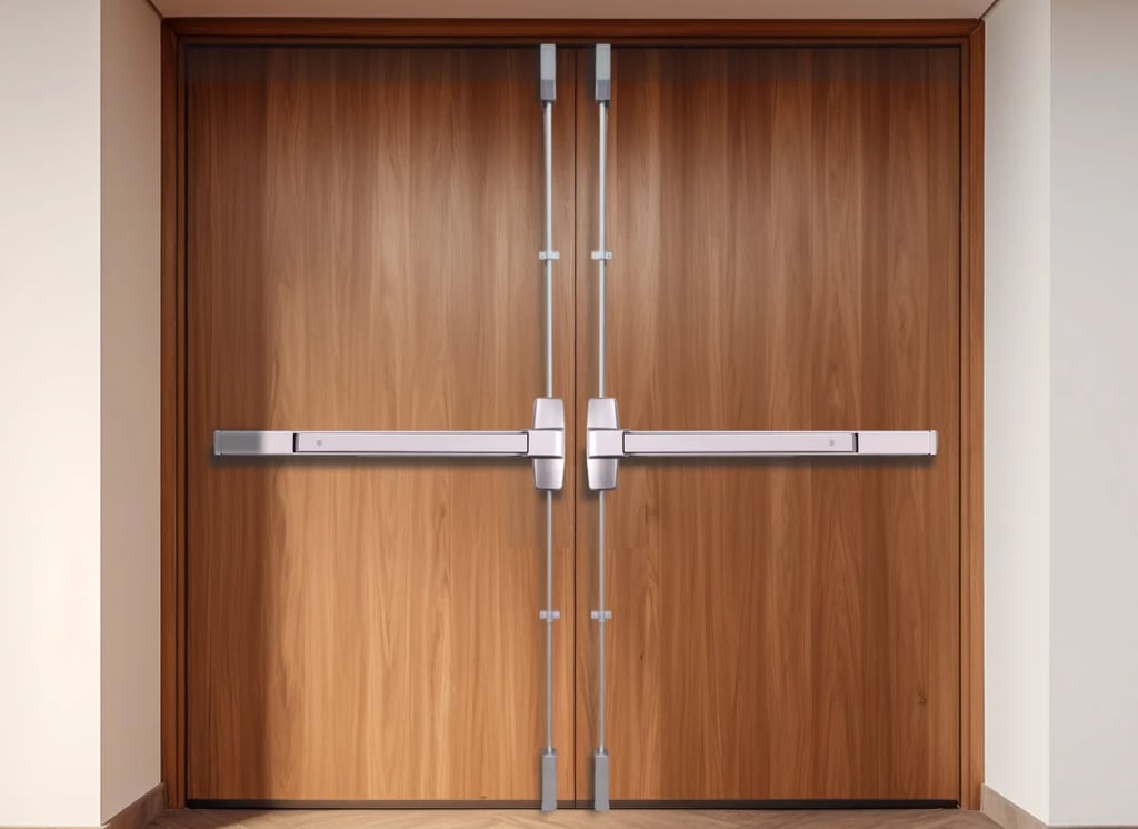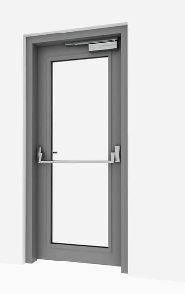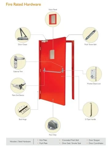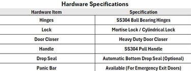 Hardware: Fire-rated Hinges, Lock, Door Closer, Panic Bar (if required)