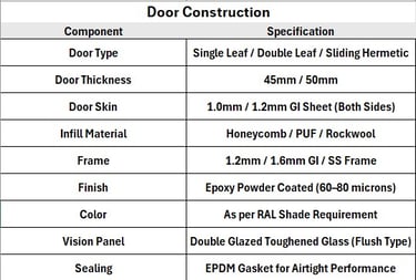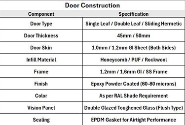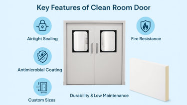 Clean Room Doors are specially designed doors used in controlled environments where air quality, hygiene, and contamination control are critical. These doors are installed in industries like pharmaceuticals, hospitals, laboratories, food processing units, and electronics manufacturing.