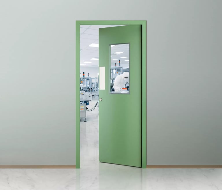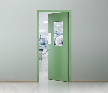 Specially designed doors for pharmaceutical, hospital, and controlled environments.