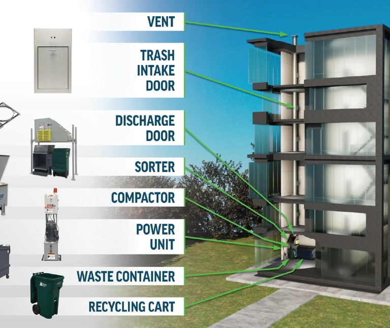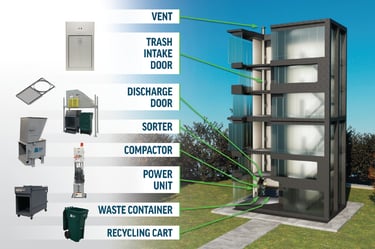 Vertical waste disposal system installed in multi-storey buildings that allows residents or staff to dispose of waste easily and hygienically