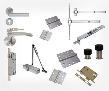Ironmongery refers to essential door hardware components such as hinges, locks, handles, closers, panic bars, and accessories that ensure doors function safely, securely, and efficiently.